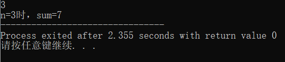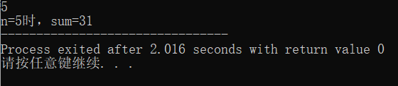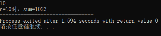 #include<stdio.h> #include<math.h> int main(){ int n,sum; scanf("%d",&n); sum=1*(1-pow(2,n))/(1-2); printf("n=%d时,sum=%d",n,sum); return 0; }