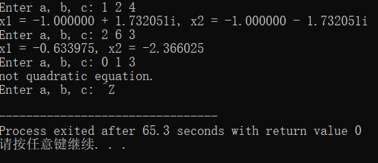 #include <math.h> #include <stdio.h> void solve(double a, double b, double c); int main() { double a, b, c; printf("Enter a, b, c: "); while(scanf("%lf%lf%lf", &a, &b, &c) != EOF) { solve(a, b, c); printf("Enter a, b, c: "); } return 0; } void solve(double a, double b, double c) { double x1, x2; double delta, real, imag; if(a == 0) printf("not quadratic equation.\n"); else { delta = b*b - 4*a*c; if(delta >= 0) { x1 = (-b + sqrt(delta)) / (2*a); x2 = (-b - sqrt(delta)) / (2*a); printf("x1 = %f, x2 = %f\n", x1, x2); } else {real = -b/(2*a); imag = sqrt(-delta) / (2*a); printf("x1 = %f + %fi, x2 = %f - %fi\n", real, imag, real, imag); } } }