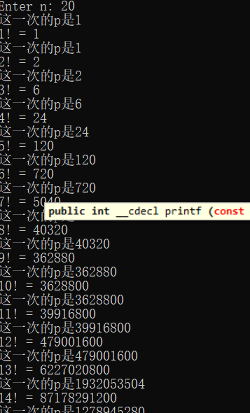 // 利用局部static变量计算阶乘 #include <stdio.h> long long fac(int n); // 函数声明 int main() { int i,n; printf("Enter n: "); scanf("%d", &n); for(i=1; i<=n; ++i) printf("%d! = %lld\n", i, fac(i)); return 0; } // 函数定义 long long fac(int n) { static long long p = 1; printf("这一次的p是%d\n",p); p = p*n; return p; }