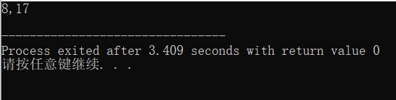 // 练习:局部static变量特性 #include<stdio.h> int func(int, int); int main() { int k=4,m=1,p1,p2; p1 = func(k,m) ; p2 = func(k,m) ; printf("%d,%d\n",p1,p2) ; return 0; } int func(int a,int b) { static int m=0,i=2; i += m+1;//0+1+2=3 //8+1+3=12 m = i+a+b;//3+4+1=8 //12+4+1=17 return (m); }