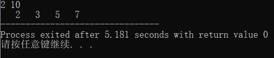 //寻找两个整数之间的所有素数(包括这两个整数),把结果保存在数组bb中,函数返回素数的个数。 // 例如,输入6和21,则输出为:7 11 13 17 19。 #include <stdio.h> #define N 1000 int fun(int n,int m,int bb[N]) { int i,j,k=0,flag; for(j=n;j<=m;j++) { flag=1; for(i=2;i<j;i++) if(j%i==0) { flag=0; break; } if(flag==1) bb[k++]=j; } return k; } int main(){ int n=0,m=0,i,k,bb[N]; scanf("%d",&n); scanf("%d",&m); for(i=0;i<m-n;i++) bb[i]=0; k=fun(n,m,bb); for(i=0;i<k;i++) printf("%4d",bb[i]); return 0; }