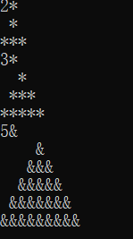 #include <stdio.h> void draw(int n, char symbol); // 函数声明 #include <stdio.h> int main() { int n, symbol; while(scanf("%d %c", &n, &symbol) != EOF) { draw(n, symbol); // 函数调用 printf("\n"); } return 0; } // 函数定义 void draw(int n,char symbol) { int line,col; for(line=0;line<n;line++) { for(col=1;col<n-line;col++) printf(" "); for(;col<=n+line;col++) printf("%c",symbol); for(;col<2*n;col++) printf(" "); printf("\n"); } }