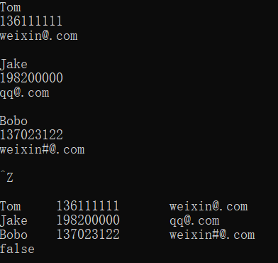 #include <iostream> #include <fstream> #include <vector> #include "Person.hpp" int main() { using namespace std; vector<Person> phone_book; Person p; while (cin >> p) phone_book.push_back(p); for (auto& i : phone_book) cout << i << endl; cout << boolalpha << (phone_book.at(0) == phone_book.at(1)) << endl; ofstream fout; fout.open("phone_book.txt"); if (!fout.is_open()) { cerr << "fail to open file phone_book.txt\n"; return 1; } for (auto& i : phone_book) fout << i << endl; fout.close(); }