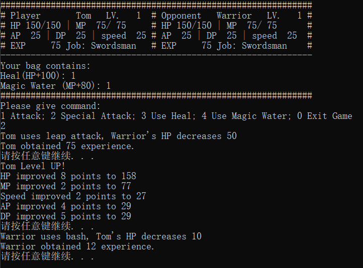 //======================= // main.cpp //======================= // main function for the RPG style game #include <iostream> #include <string> using namespace std; #include "swordsman.h" int main() { string tempName; bool success = 0; //flag for storing whether operation is successful cout << "Please input player's name: "; cin >> tempName; // get player's name from keyboard input player* human = NULL; // use pointer of base class, convenience for polymorphism int tempJob; // temp choice for job selection do { cout << "Please choose a job: 1 Swordsman, 2 Archer, 3 Mage" << endl; cin >> tempJob; system("cls"); // clear the screen switch (tempJob) { case 1: human = new swordsman(1, tempName); // create the character with user inputted name and job success = 1; // operation succeed break; default: break; // In this case, success=0, character creation failed } } while (success != 1); // so the loop will ask user to re-create a character int tempCom; // temp command inputted by user int nOpp = 0; // the Nth opponent for (int i = 1;nOpp < 5;i += 2) // i is opponent's level { nOpp++; system("cls"); cout << "STAGE" << nOpp << endl; cout << "Your opponent, a Level " << i << " Swordsman." << endl; system("pause"); swordsman enemy(i, "Warrior"); // Initialise an opponent, level i, name "Junior" human->reFill(); // get HP/MP refill before start fight while (!human->death() && !enemy.death()) // no died { success = 0; while (success != 1) { showinfo(*human, enemy); // show fighter's information cout << "Please give command: " << endl; cout << "1 Attack; 2 Special Attack; 3 Use Heal; 4 Use Magic Water; 0 Exit Game" << endl; cin >> tempCom; switch (tempCom) { case 0: cout << "Are you sure to exit? Y/N" << endl; char temp; cin >> temp; if (temp == 'Y' || temp == 'y') return 0; else break; case 1: success = human->attack(enemy); human->isLevelUp(); enemy.isDead(); break; case 2: success = human->specialatt(enemy); human->isLevelUp(); enemy.isDead(); break; case 3: success = human->useHeal(); break; case 4: success = human->useMW(); break; default: break; } } if (!enemy.death()) // If AI still alive enemy.AI(*human); else // AI died { cout << "YOU WIN" << endl; human->transfer(enemy); // player got all AI's items } if (human->death()) { system("cls"); cout << endl << setw(50) << "GAME OVER" << endl; char select; cout << "Would you like to continue? Y/N\n"; cin >> select; if (select == 'Y') continue; else cout << "Pity! You lose the game!";// player is dead, program is getting to its end, what should we do here? system("pause"); return 0; } } } char select; cout << "Do you dependend on yourself? Y/N\n"; cin >> select; if (select == 'Y') cout << "How smart!\n"; else cout << "Pity!";// You win, program is getting to its end, what should we do here? system("cls"); cout << "Congratulations! You defeated all opponents!!" << endl; system("pause"); return 0; }