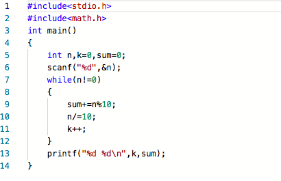 对于给定的正整数N,求它的位数及其各位数字之和。