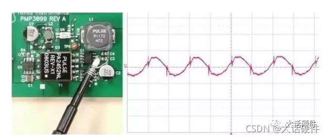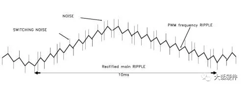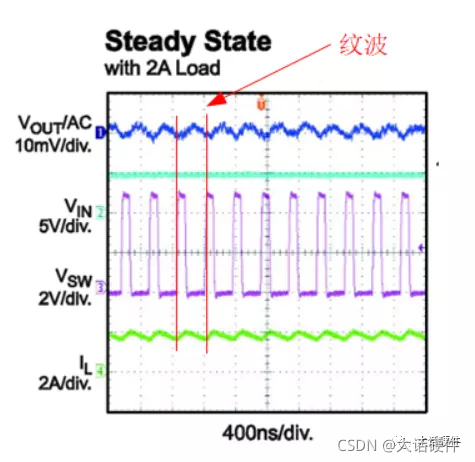 即电源纹波是指在直流信号上的交流干扰信号,这个干扰信号波动的频率和开关频率相同。