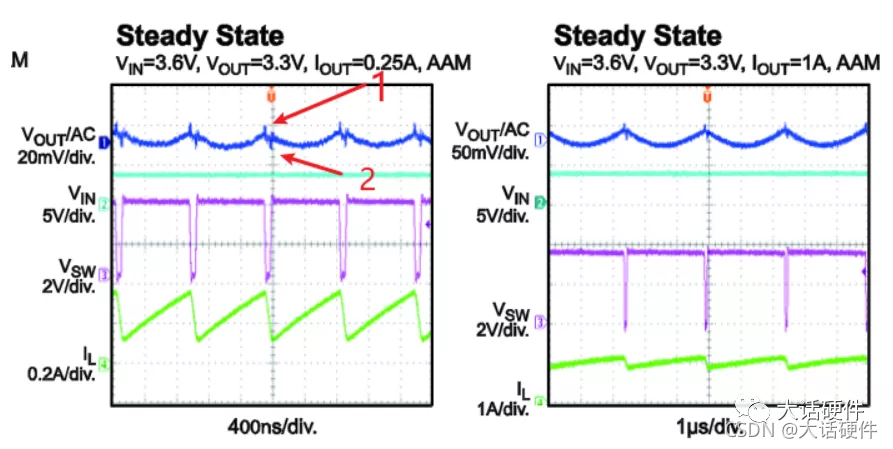 接着刚刚MP16xx电源芯片的规格书,可以看到在输出电压波形上,箭头1和箭头2处的尖峰。从波形图上可以看出: