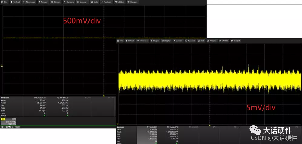 上面的内容是把电压纹波和电压噪声进行了分开定义和说明,但是在实际测试的波形中,如果使用500mV/div的分辨率来看输出电压,看到的是稳定的直流电压,如果用5mV/div分分辨率来看输出电源,看到的是既有开关频率的纹波,也有非连续,无规律的噪声。