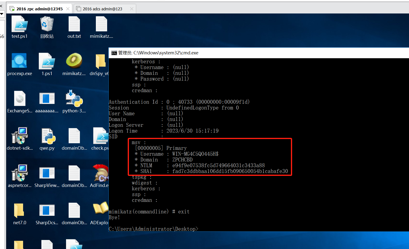 - 读取域控192.168.75.202的administrator域管的ntlm,假设已经知道了域控WIN-MG4C5QO445H的哈希,这边演示所以直接在域控WIN-MG4C5QO445H上dump出对应的域控机器的哈希了