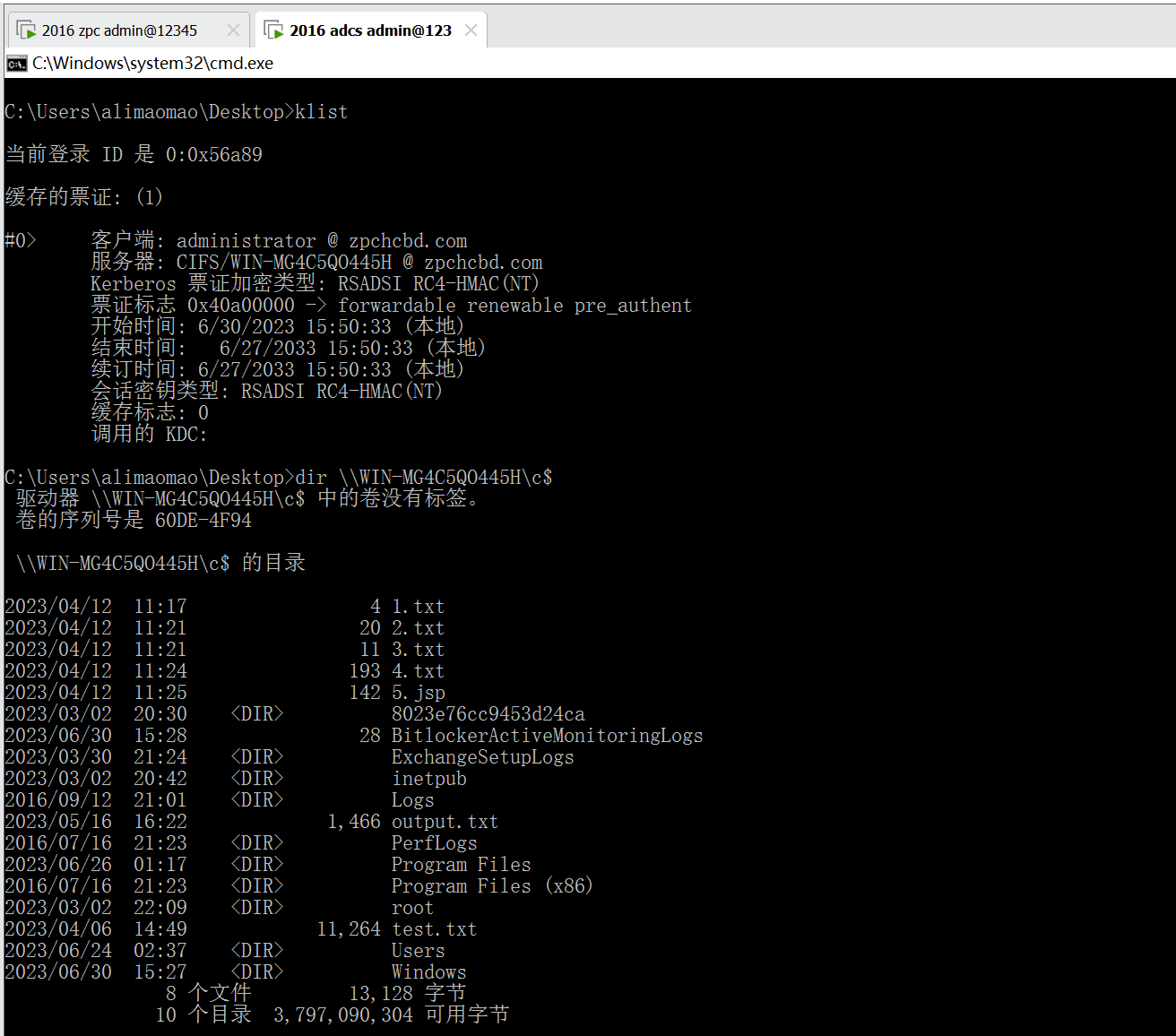 dir \\WIN-MG4C5QO445H\c$,结果如下所示,可以看到利用成功