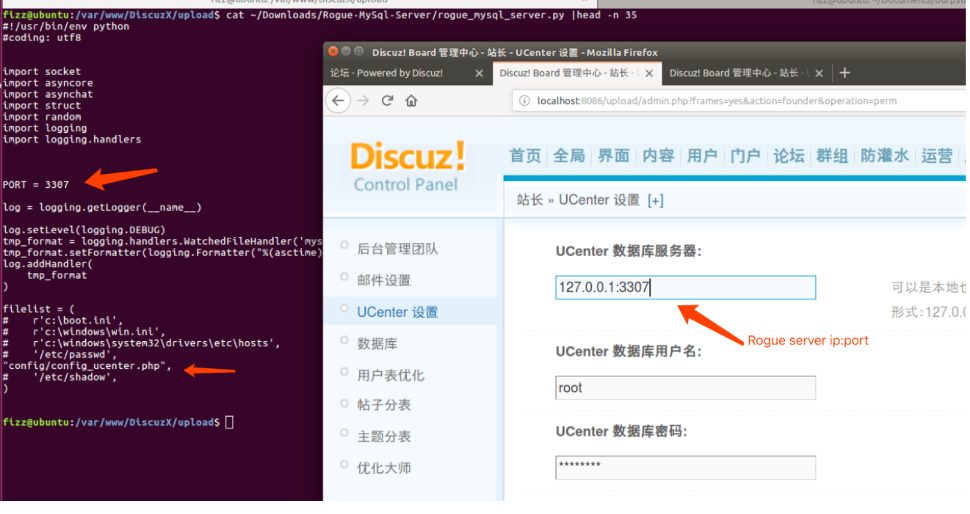 1、在dz的后台,有一个Ucenter的设置功能,这个功能中提供了ucenter的数据库服务器配置功能,通过配置数据库链接恶意服务器,可以实现任意文件读取获取配置信息。