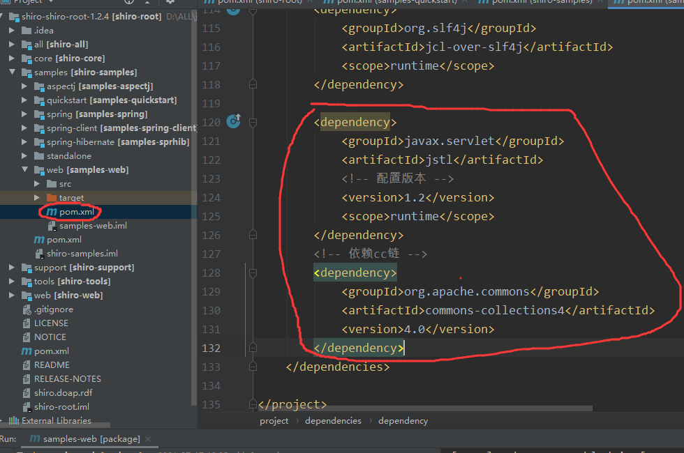 因为我们这里攻击的话需要用到相关的cc依赖,所以还需要现在工程下面添加依赖,jstl库是shiro core自身需要用到的,commons-collection4是为了漏洞环境准备的