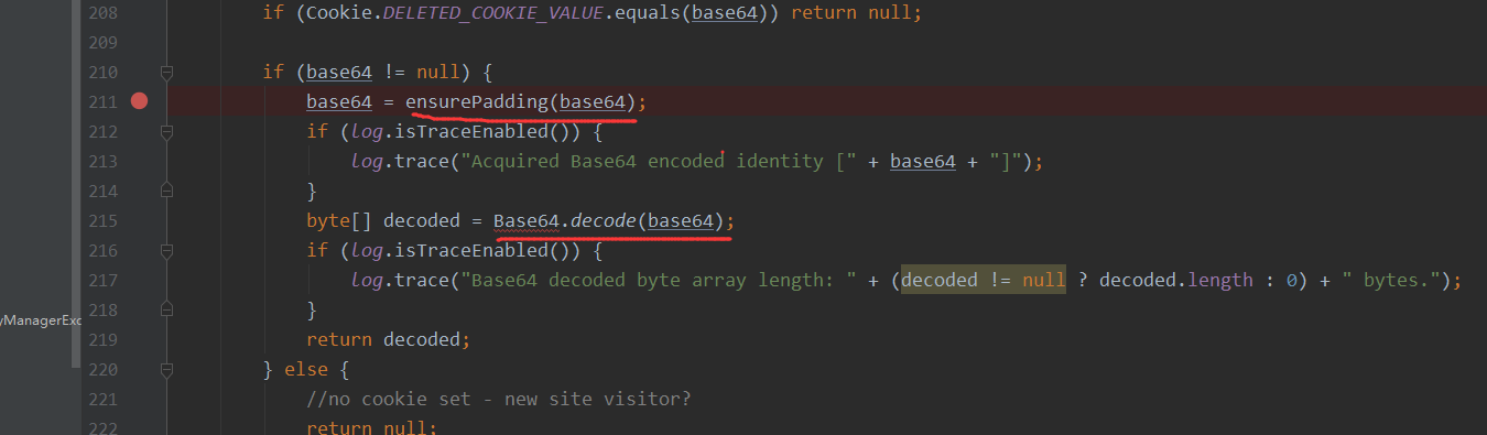 org/apache/shiro/web/mgt/CookieRememberMeManager.java#getRememberedSerializedIdentity这个方法则对每次的HTTP请求接收的cookie进行解析,首先进行操作的就是Base64解码