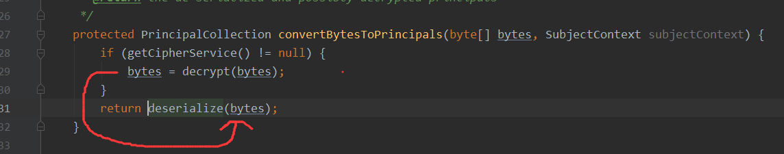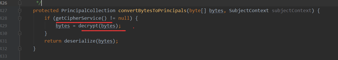 而getRememberedPrincipals方法中当通过getRememberedSerializedIdentity获得了字节之后,这里还会将其作为convertBytesToPrincipals的参数进行执行,convertBytesToPrincipals方法为如下,此时的字节数据已经是Base64进行解码的了,这里的encrypt则是进行解密
