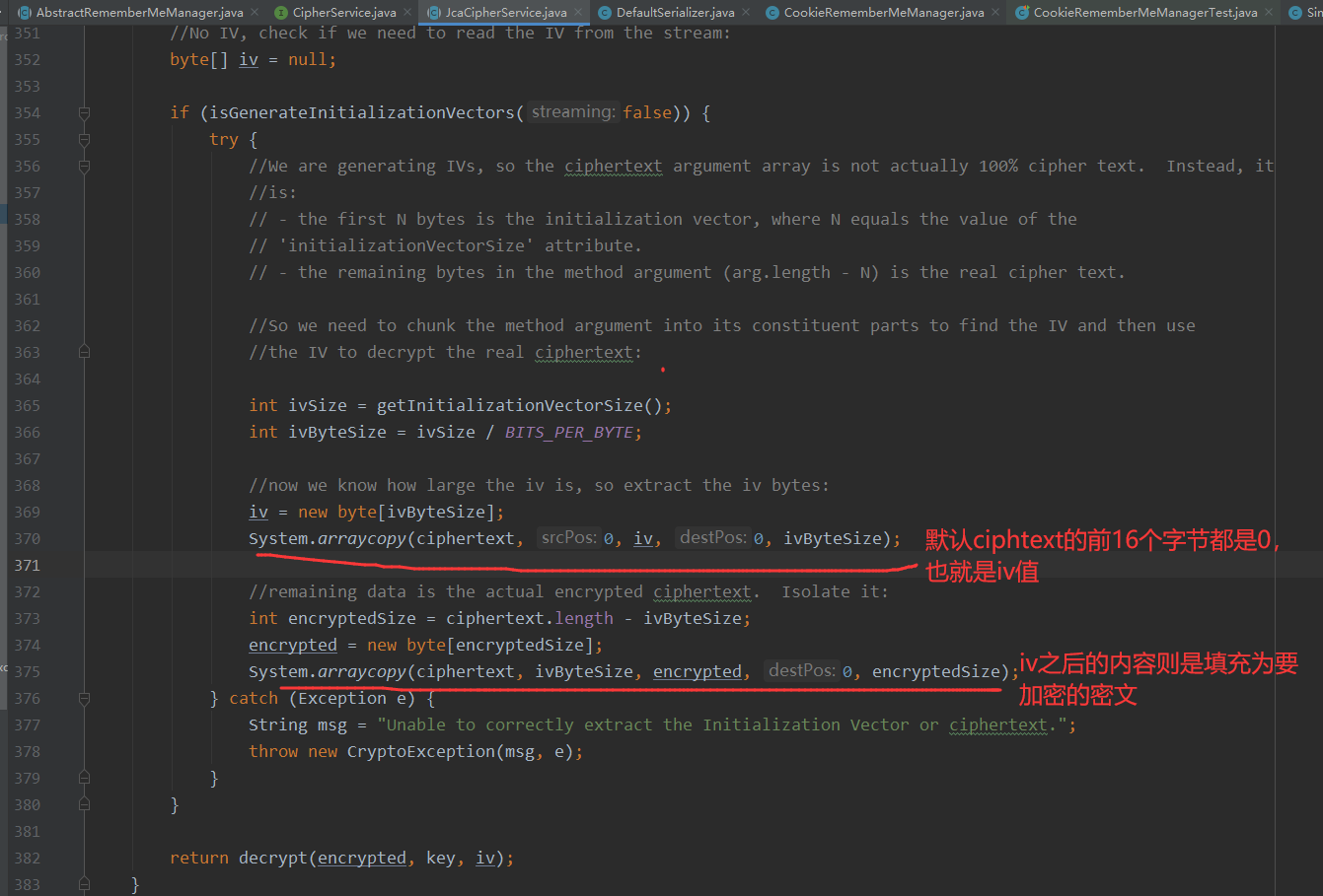 接着就是JcaCipherService#public ByteSource decrypt(byte[] ciphertext, byte[] key),这个方法中就是生成IV值 和 设置IV值和要解密的内容的存储位置