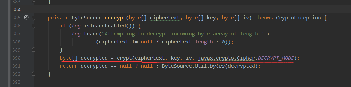 接着就是下面的decrypt(encrypted, key, iv)方法,这里则声明了解密的模式为javax.crypto.Cipher.DECRYPT_MODE