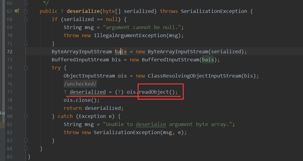 Shiro自己实现了一个反序列化类org/apache/shiro/io/DefaultSerializer.java#deserialize,这里的readOjbect进行反序列化,最后触发反序列化