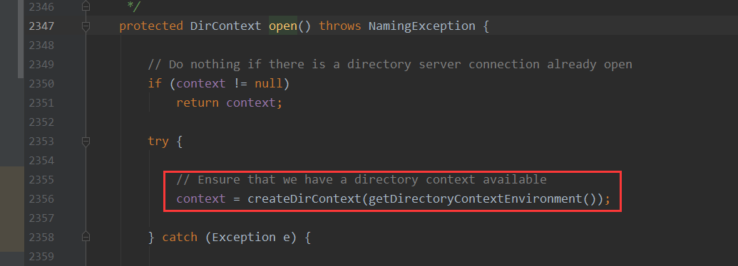 该方法中的open方法如下所示,它通过createDirContext方法根据getDirectoryContextEnvironment当前环境信息配对的一个JNDI目录服务对象,从而触发JNDI注入