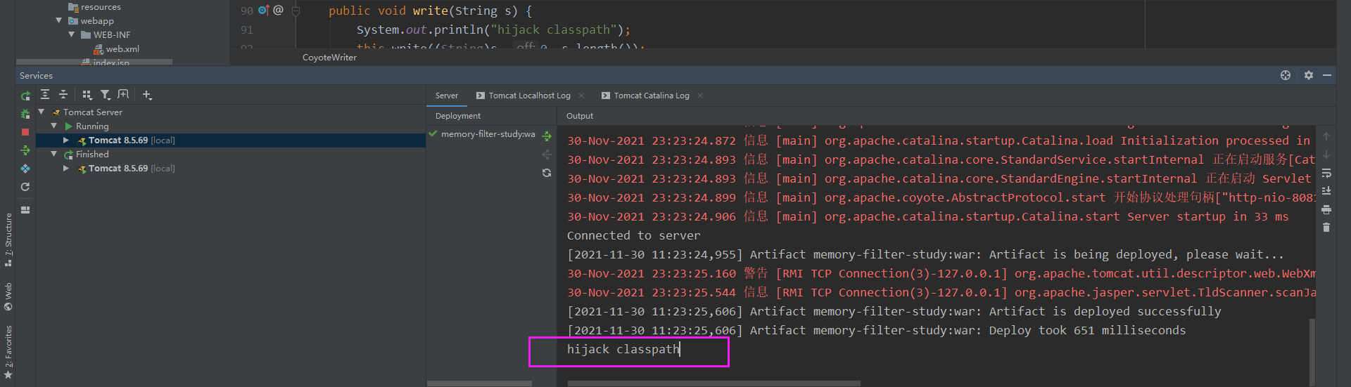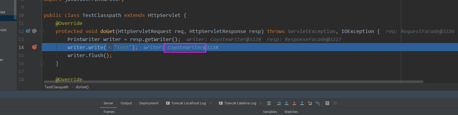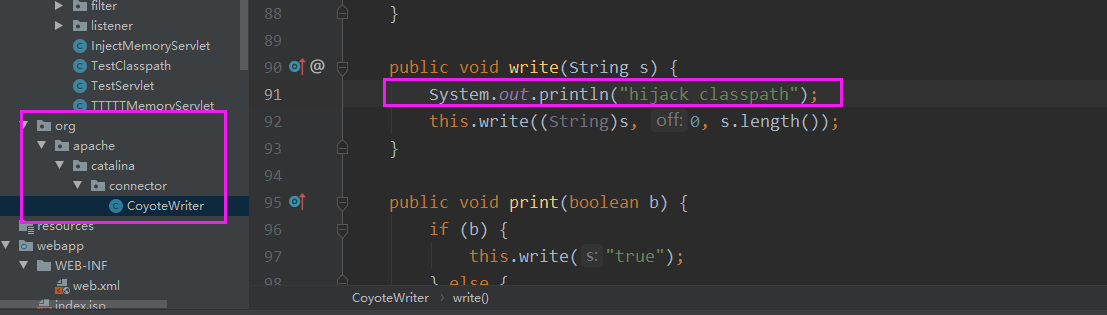 要劫持的话就劫持开发者就频繁用到的函数,比如PrintWriter的write方法,调试的话可以发现Tomcat中使用的对象为CoyoteWriter对象
