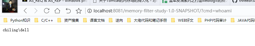 接着访问内存马http://localhost:8081/memory-filter-study-1.0-SNAPSHOT/?cmd=whoami
