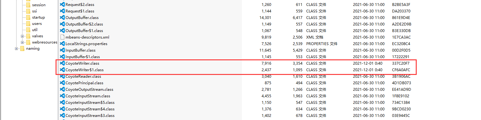 然后重新进行替换,如下图所示,将修改过的catalina.jar重新覆盖到tomcat中去,这里需要注意的就是 除了CoyoteWriter.class,还需要一个内部类CoyoteWriter$1.class
