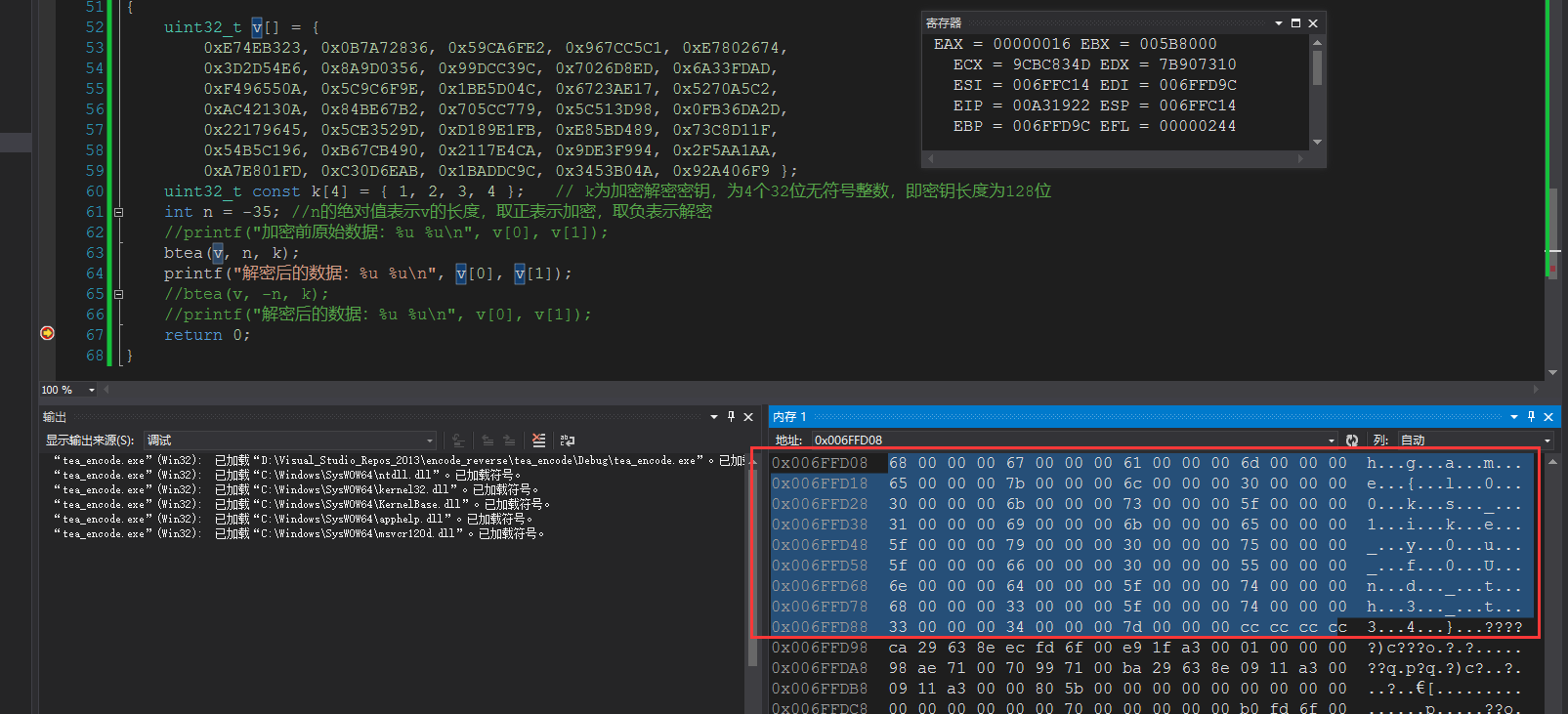 printf("解密后的数据:%u %u\n", v[0], v[1]);