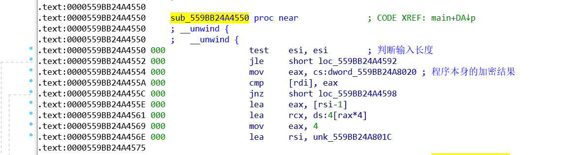 .text:0000559BB24A4678 048 call sub_559BB24A4550 ; 验证加密完的字符串是否跟程序本身要判断的相等