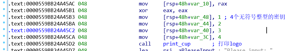 .text:0000559BB24A45B3 048 mov [rsp+48h+var_48], 1 ; 4个无符号整型的密钥
