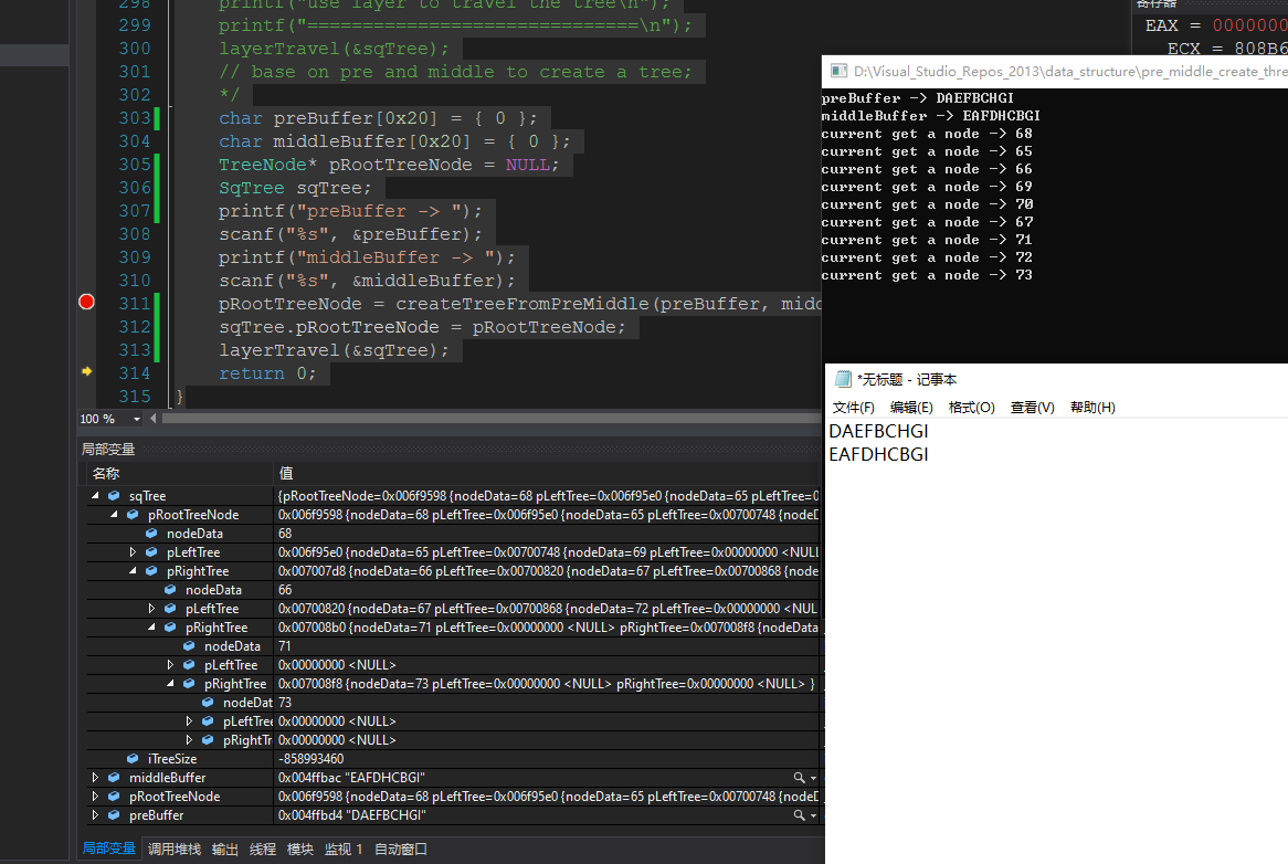 pTreeNode->pRightTree = createTreeFromPreMiddle(newRightPreString, newRightMiddleString); // 构建当前结点的右子树