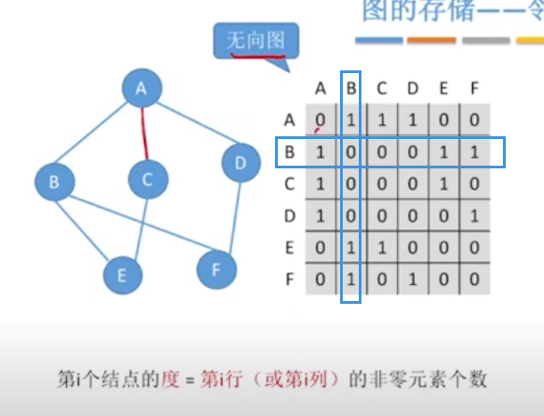 这里先拿无向图来进行说明,如果想看如下图中的B顶点的入度和出度的话,在无向图中可以看到入度和出度都是一样的,所以无向图的邻接矩阵中行和列都是可以进行计算相关顶点的入度和出度