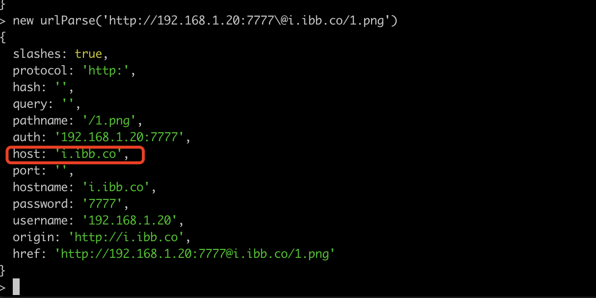 在nodejs中对于http://192.168.1.20:7777\@i.ibb.co/1.png 解析的情况如下所示,可以看到最终解析的是重定向到了i.ibb.co地址