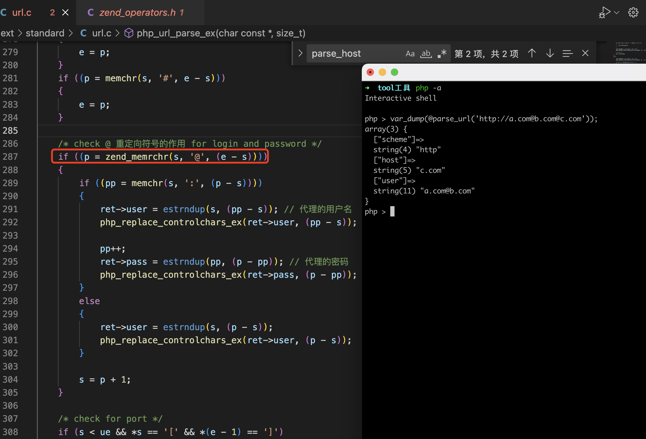 通过php的源代码可以看到ext/standard/url.c 中的 php_url_parse_ex方法中对于@符号的处理,是右往左搜索,所以优先选择最右边的@符号