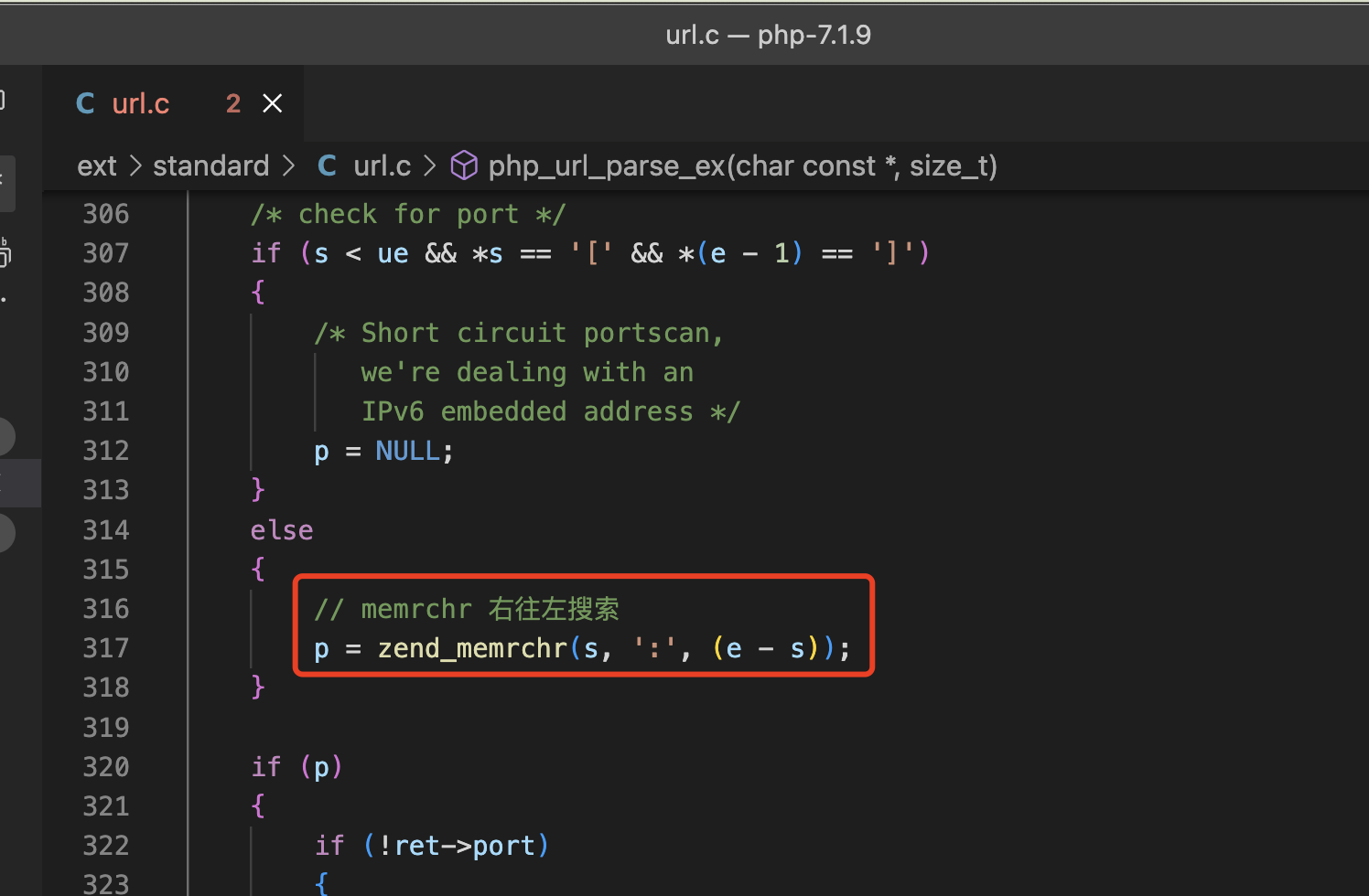 通过php的源代码可以看到ext/standard/url.c 中的 php_url_parse_ex方法中对于处理完整的url参数的时候,端口的获取是右往左搜索,所以优先选择最右边的冒号符号