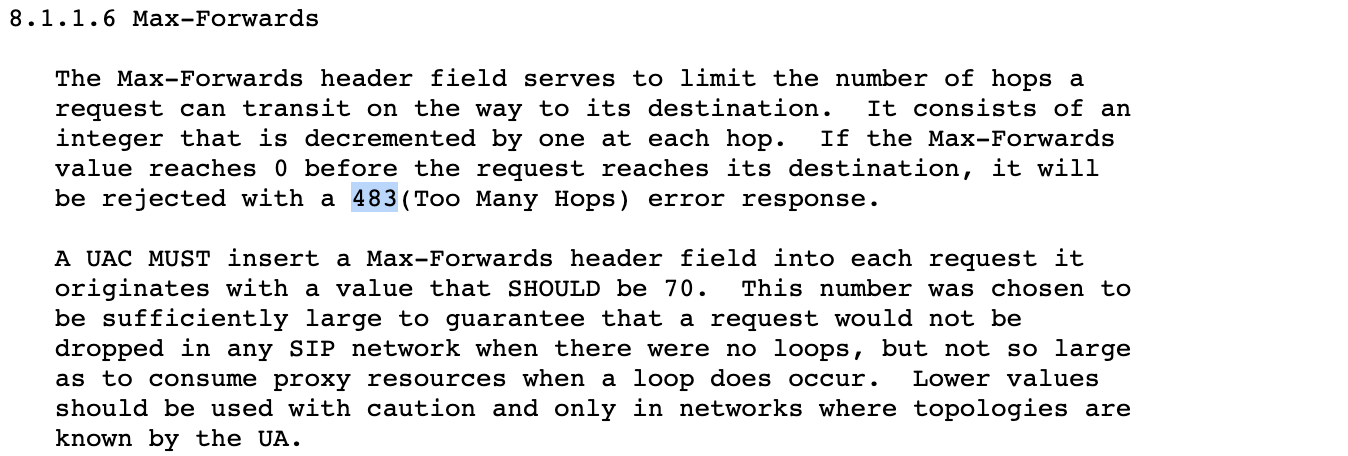 - A 483 status code is returned (RFC 3261, section 8.1.1.6)