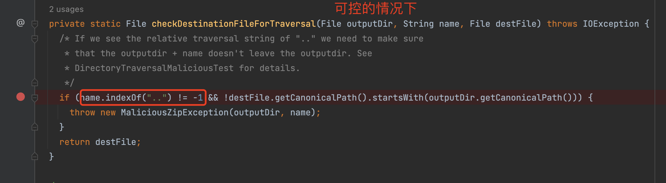 主要是这个条件的判断name.indexOf("..") != -1 && !destFile.getCanonicalPath().startsWith(outputDir.getCanonicalPath())走的是&&,那么如果想要不成立的话则第一个判断不成立,而另外一个outputDir可控的话那么则可以进行绕过,而在这里的zt-zip库中并没有对outputDir进行有效的过滤所以造成了上面这种绕过情况
