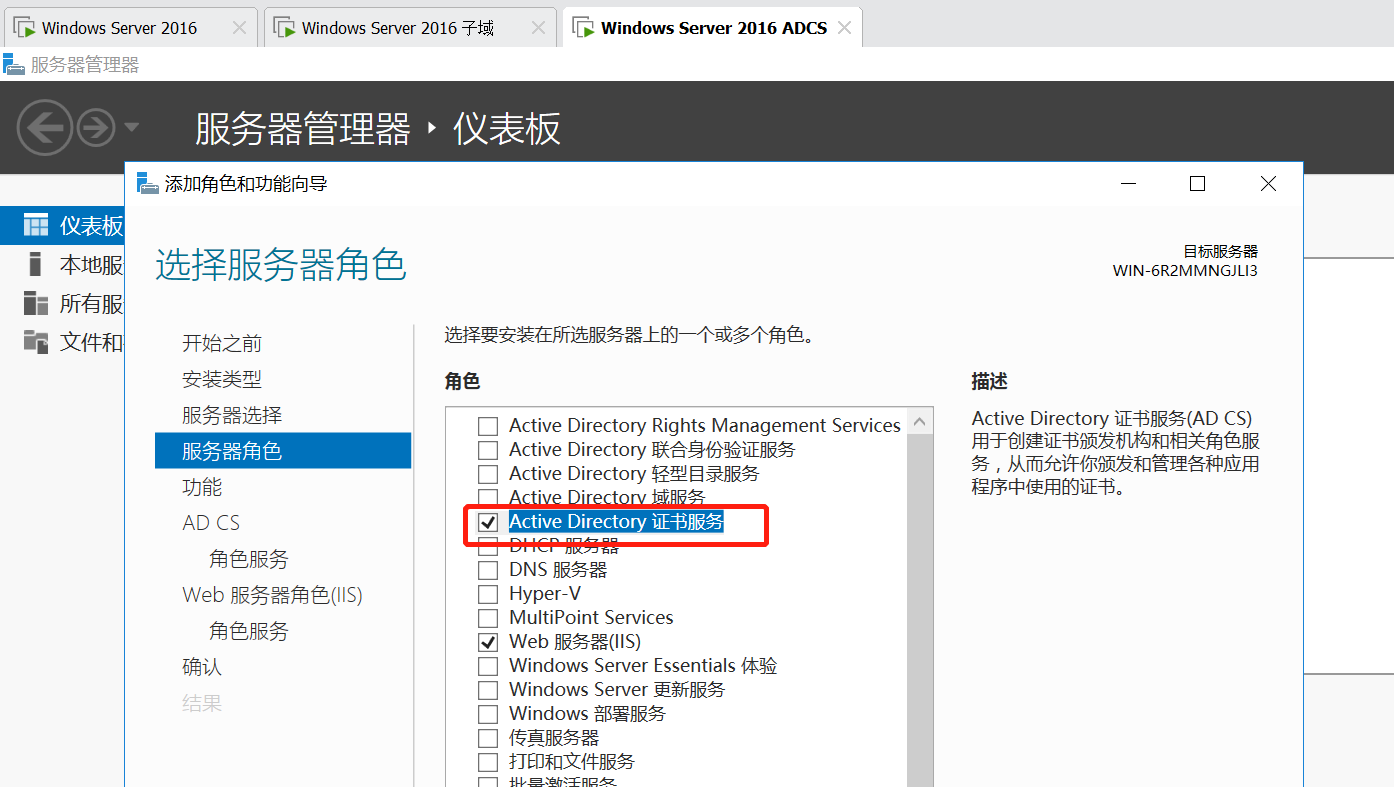 在服务器管理器面板中中选择"添加角色和向导",这里主要注意的两个地方就是如下