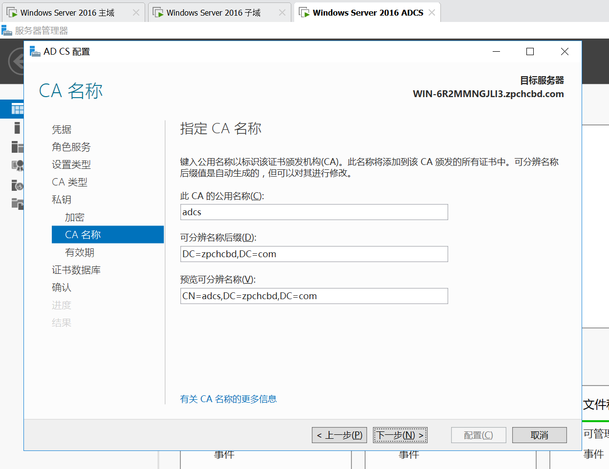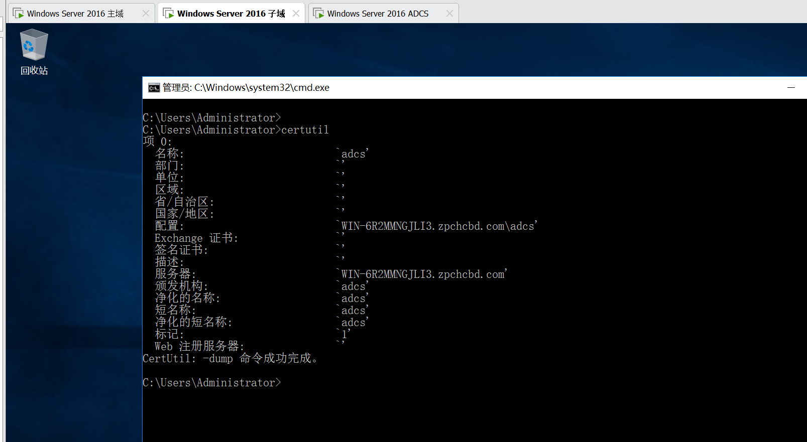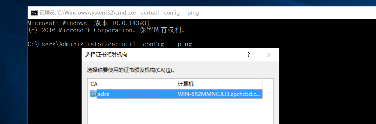 来检测域林中存在的证书服务器,如下所示,可以看到WIN-6R2MMNGJLI3.zpchcbd.com存在证书服务