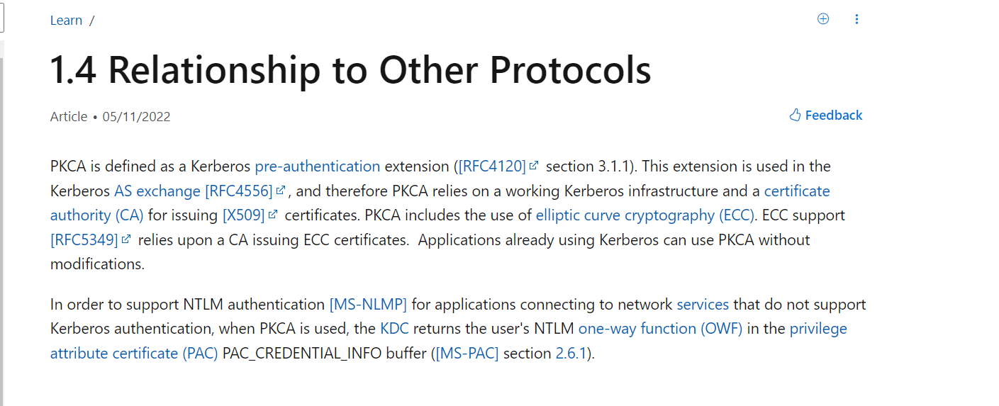 在微软的文档里有一段话"当使用PKCA时,KDC在权限属性证书(PAC)中会返回用户的NTLM",也就是说当使用证书进行Kerberos认证的时候,返回票据的PAC包里面还有NTLM票据,故可以用于获取用户NTLM Hash。