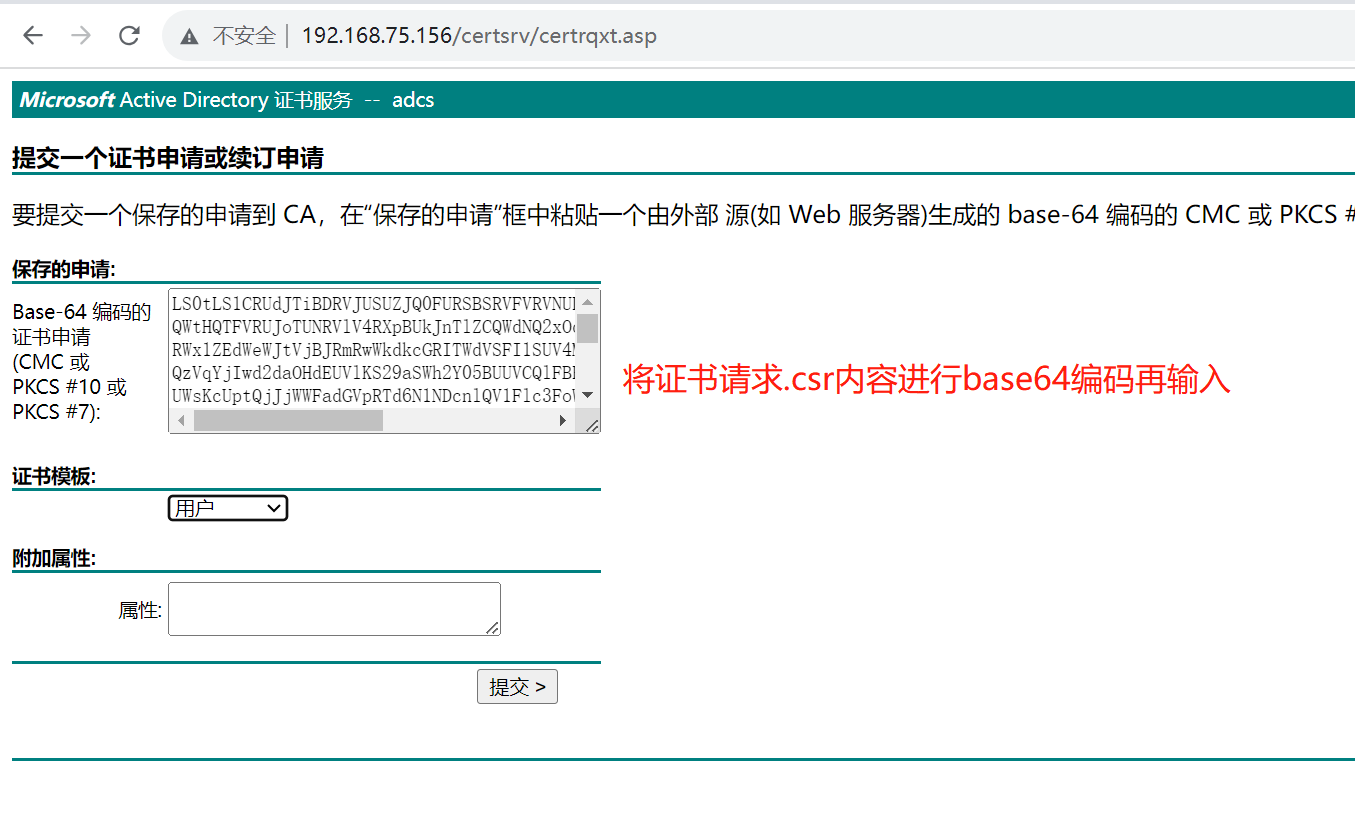 接着提交server.scr证书请求,这边访问ADCS服务器的web服务(前提安装的时候支持WEB服务),如下图所示,将上面的证书请求内容base64编码后输入进去即可