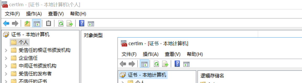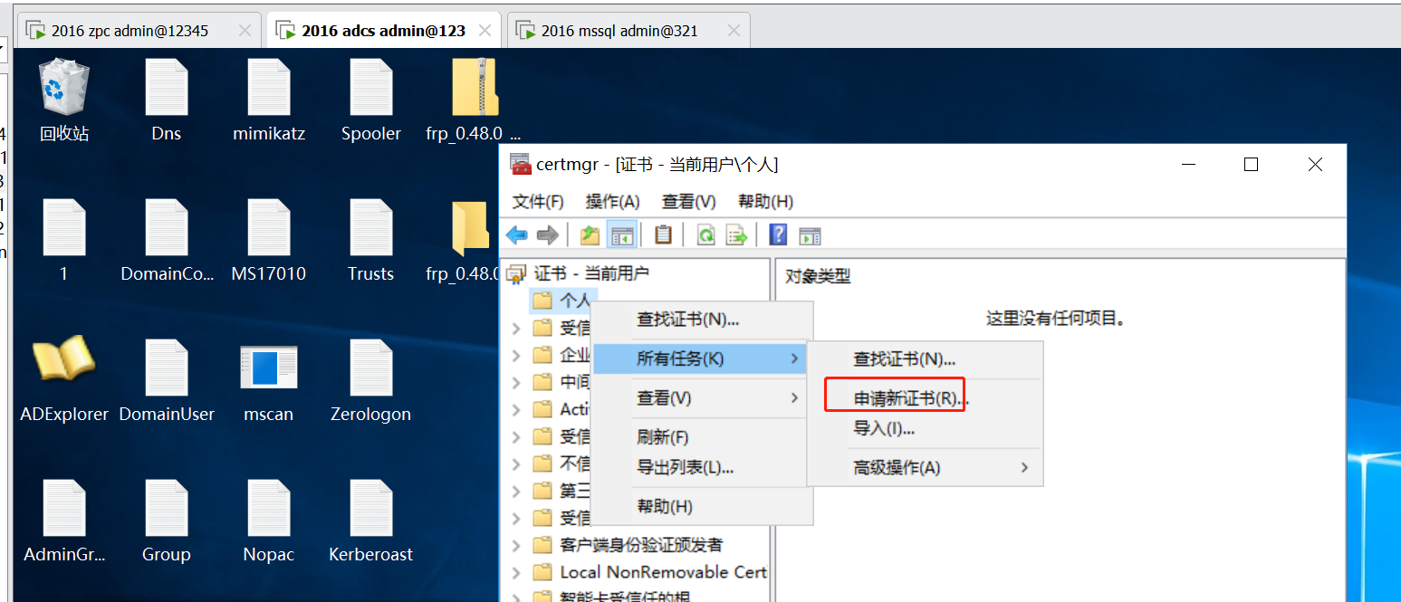 certmgr.msc申请证书,这边创建个人证书,点击申请新证书,如下图所示