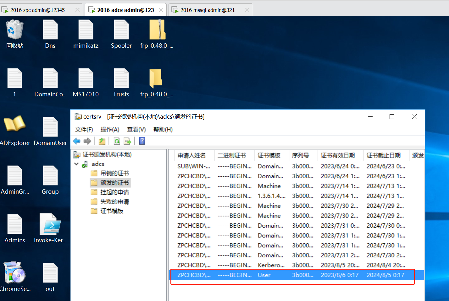 然后打开证书颁发机构来进行如下,可以看到对应的颁发证书