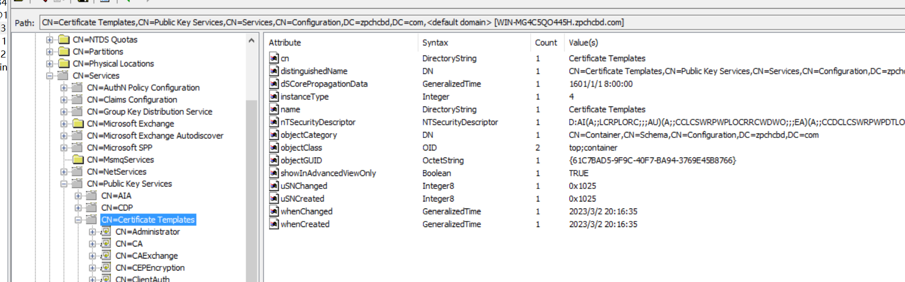 比如要观察当前ADCS服务器中的所有证书模板,这边可以查看CN=Certificate Templates,CN=Public Key Services,CN=Services,CN=Configuration,DC=zpchcbd,DC=com,<default domain> [WIN-MG4C5QO445H.zpchcbd.com]