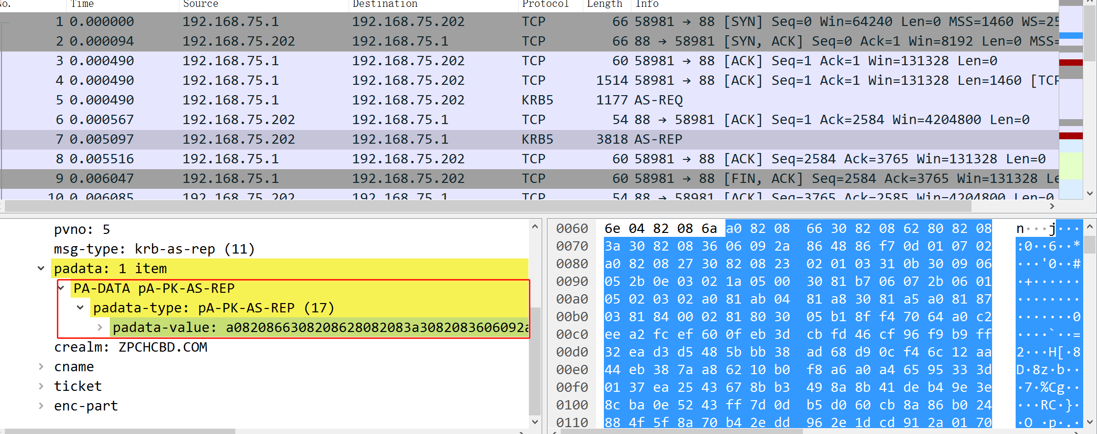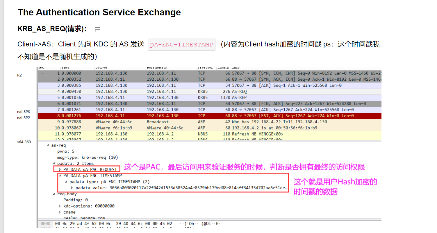 可以看到在AS-REQ认证部分是通过用户HASH加密时间戳来进行Kerberos预身份认证的。
