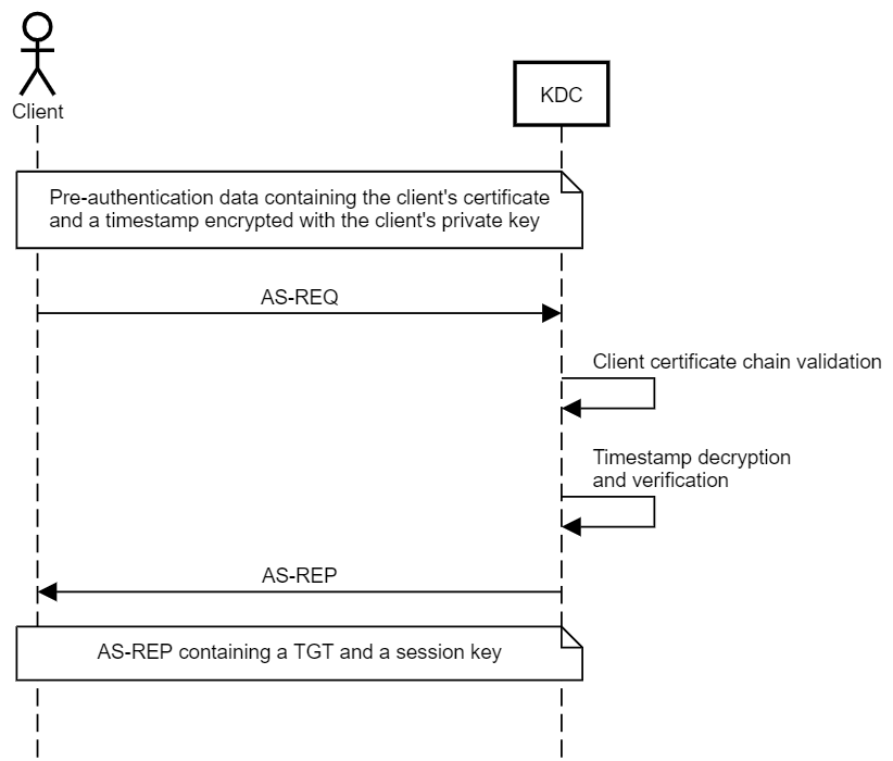 - 接着在AS-REP,KDC通过CA证书链验证客户端的身份,并获取到客户端证书里面的公钥,因为PKINIT是基于非对称密钥加密的认证方式,所以这边的话是用公钥解密时间戳,并判断时间戳是否符合规定时间,若上述身份验证通过,并且时间戳符合规则则返回TGT与一个会话密钥(其中会话密钥使用Diffie-Hellman Key Delivery/Public Key Encryption Key Deliveryq其中的一个算法生成),该会话密钥也就是在正常kerberos中交互的sessionkey。