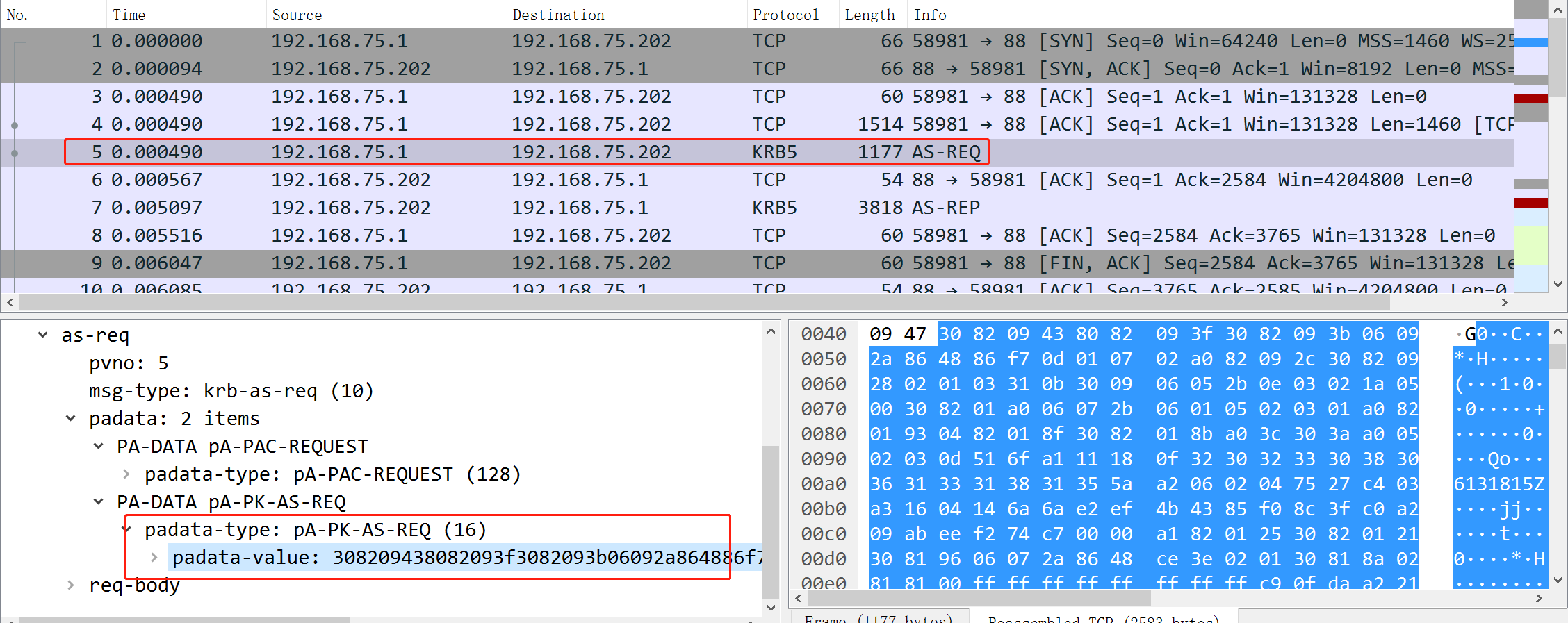 - 首先可以看到在AS-REQ认证流程中,跟正常kerberos认证的不同点是证书认证AS-REQ在AS-REQ中是客户端将当前证书里面的私钥加密的时间戳来进行发送