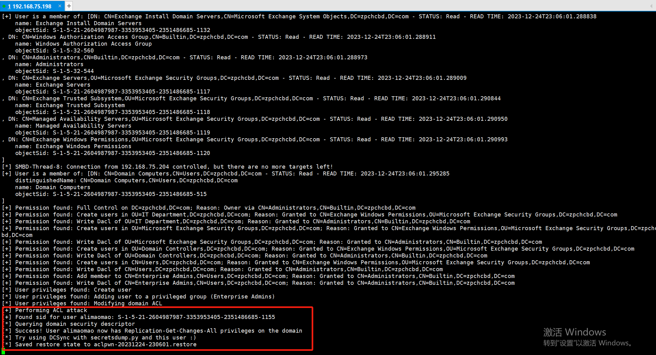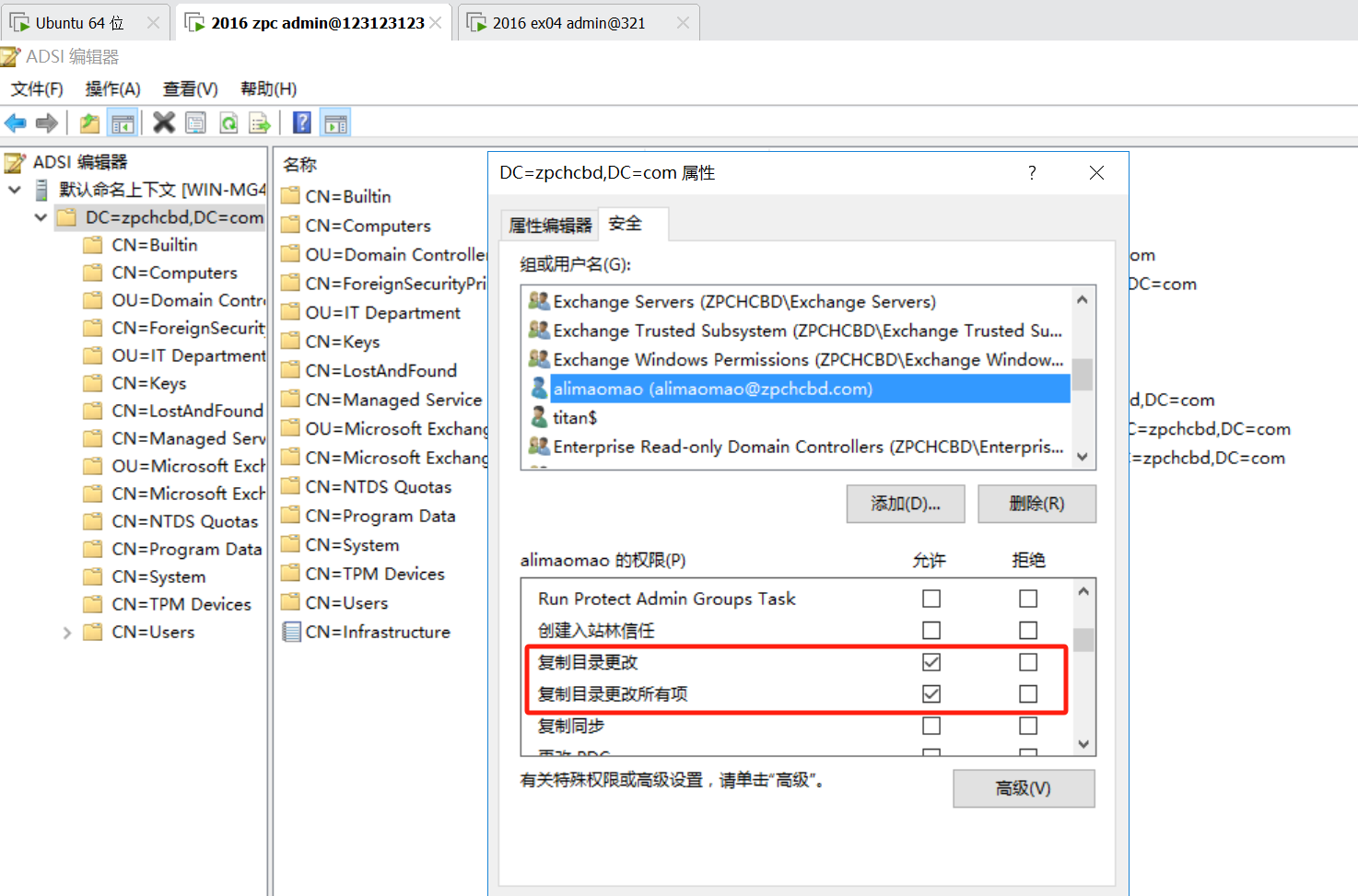 可以看到已经中继成功了,如下图所示,这边看到将当前alimaomao用户赋予了DSYNC的权限