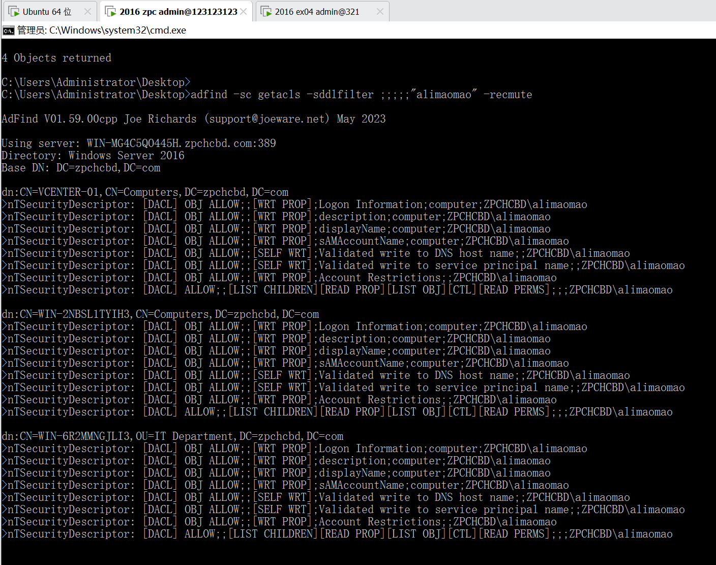 首先查看当前用Exchange的WriteDACL赋予权限的alimaomao用户的DACL,如下图所示,可以看到没有特殊的权限