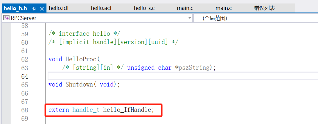 这边将hello.acf放置到和hello.idl同级的项目中重新编译即可,在新的编译生成的hello_x.h/c文件中查找关键词IfHandle,如果存在的话那么acf文件就应用上了